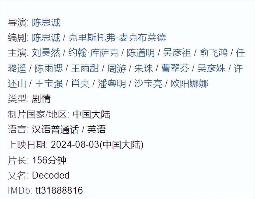 而今的《解密》,亦然一部同类型的电影,并且此片照旧由陈念念诚躬行执导。此外,该片还齐集了刘昊然、约翰库萨克、陈谈明、吴彦祖、俞飞鸿、朱珠、王宝强和肖央等多位实力派闻明演员,是以这部影片大概达成票房大爆似乎也成为了势必,只有它的口碑不是很差,只有它莫得让不雅众太极端望。