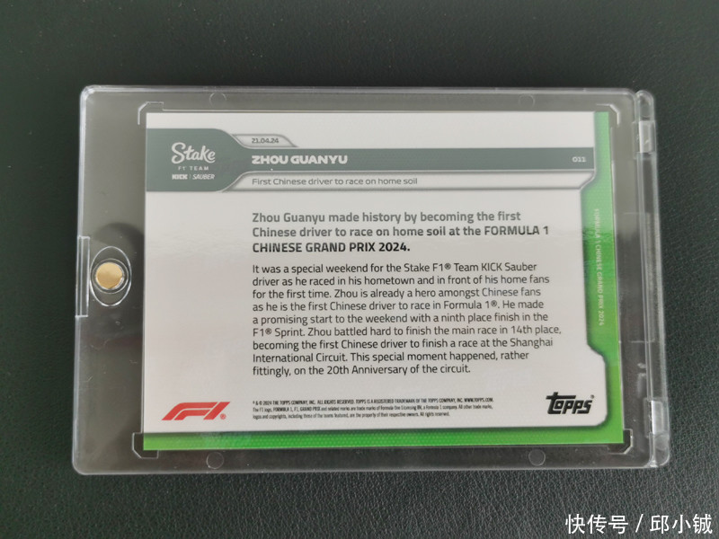 卡牌后面注明了:周冠宇成为第一位在原土参加2024年一级方程式中国大奖赛的中国车手,创造了历史。这对这位索伯F1车队车手来说是一个脱落的周末,因为他第一次在家乡的车迷眼前比赛。周还是是中国车迷中的勇士,因为他是第一位参加F1的中国车手。他在周末的F1冲刺赛中取得了第九名的好成绩。周勉力拼搏,以第14名的成绩完成了正赛,成为第一位在上海国际赛车场完赛的中国车手。这个脱落的时刻恰好发生在赛谈20周年缅想日。