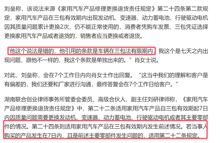 “他这个说法是错的,他援用的条件是车辆在三包法有限期内,我这个是七天之内出现问题,跟他不同样的,我这个条件是单独出来的。”肖女士说。