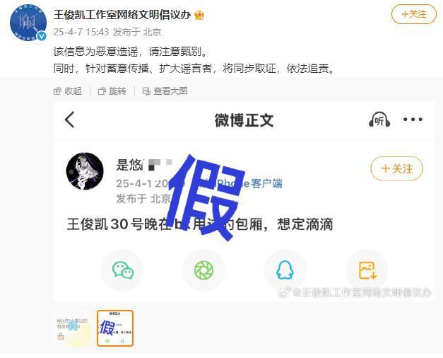 对此,7日下昼,@王俊凯职责室收罗娴雅倡议办 发布声明:“该信息为坏心责备,请细致甄别。同期,针春联想传播、扩大谣喙者,将同步取证,照章追责。”