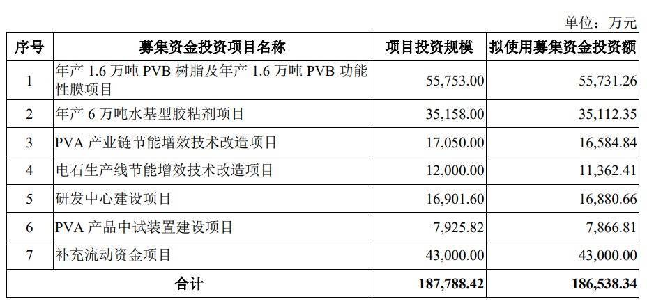 招股书清醒,双欣环保本次拟召募资金186,538.34万元,用于年产1.6万吨PVB树脂及年产1.6万吨PVB功能性膜时势、年产6万吨水基型胶粘剂时势、PVA产业链节能增效时候改良时势、电石分娩线节能增效时候改良时势、研发中心建树时势、PVA产物中试安设建树时势、补充流动资金时势。